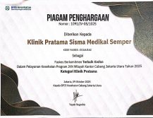 Klinik Sisma Medikal Semper meraih penghargaan sebagai Fasilitas Kesehatan Tingkat Pertama (FKTP) Terbaik ke-2 se-Jakarta Utara dari BPJS Kesehatan.